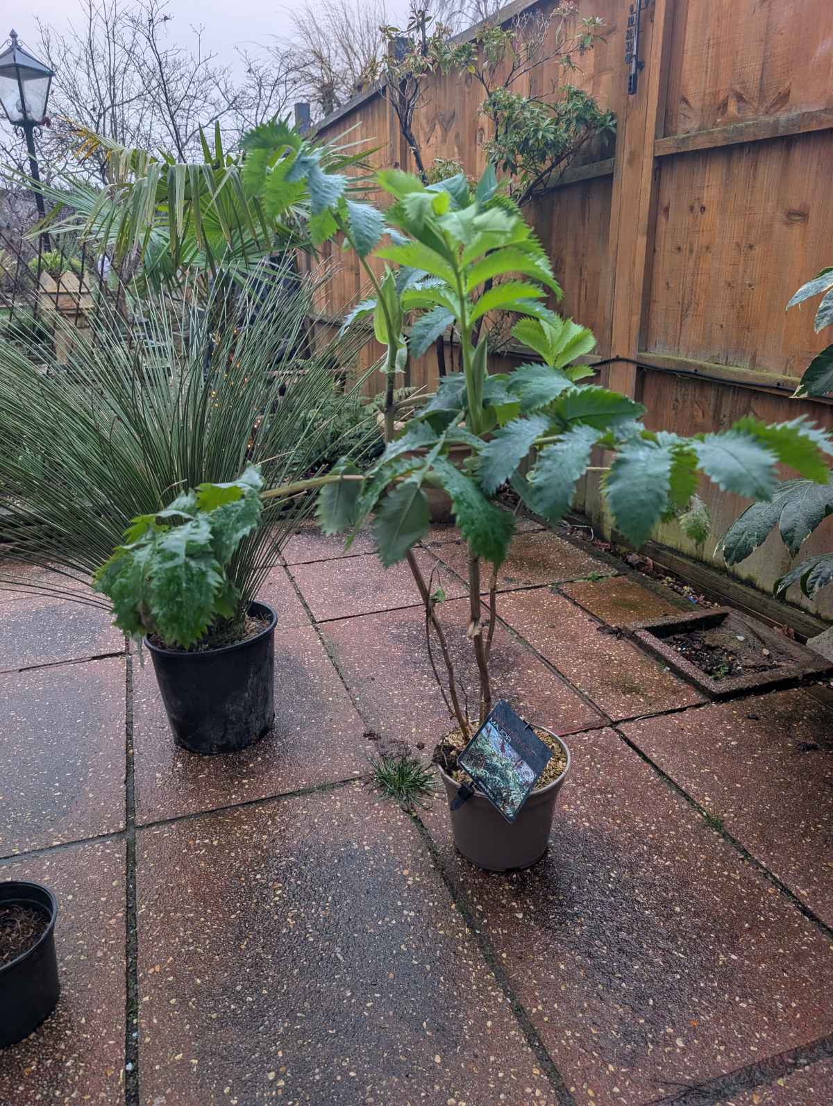 Known as honey bush, a dramatic plant with large, serrated, blue-green leaves and tall spikes of brownish-red flowers.